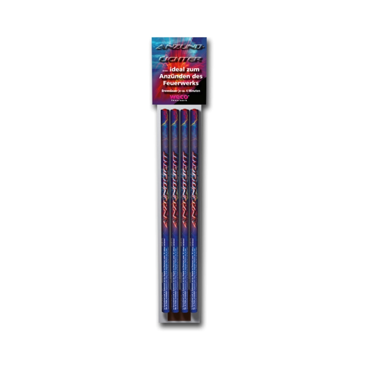 Anzündlichter von Weco (ehemals Bengal Duo). Sehr leuchtstark mit je ca. 4 Minuten Brenndauer. Ideal zum zünden von Feuerwerksartikeln. Vier Stück je Packung. Diese Feuerwerkskörper sind ganzjährig ab 12 Jahren erwerb- und verwendbar (Kategorie F1 - Jugendfeuerwerk).
